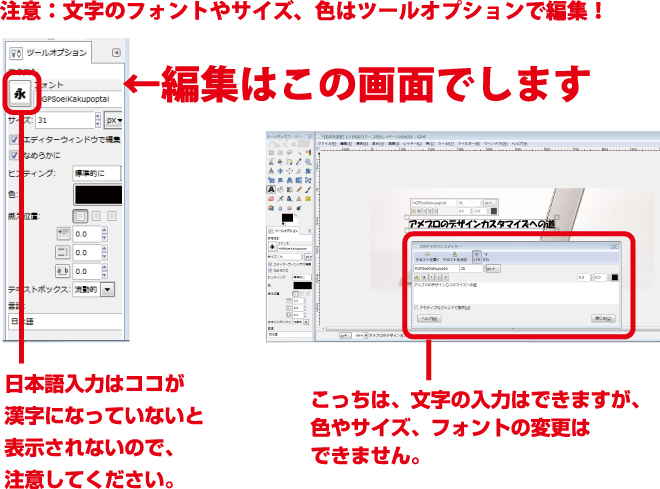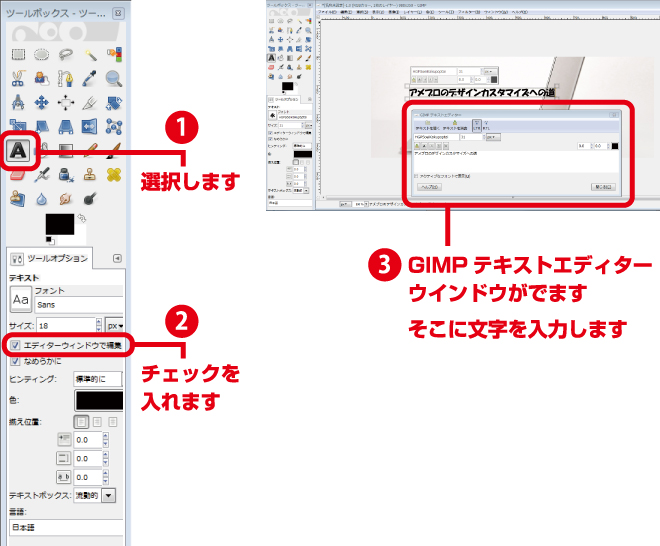1.ツールボックスの「A」を選択して、下にあります「エディターウインドウで編集」にチェックを入れます。
