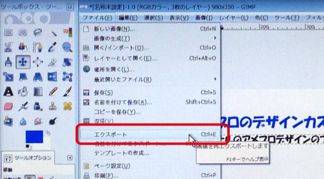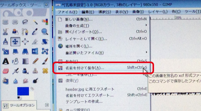 ヘッダにする画像が完成したら、アメブロに画像をアップロードするために画像をjpeg形式で保存します。ただ、JPEG画像にしてしまうと、再度編集ができなくなるため、GIMPで再度編集ができるxfc形式でも保存しておきます。2種類にして保存というのはそのためです。