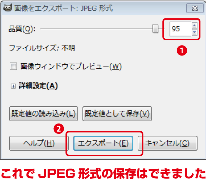 3.品質を設定して「エクスポート」をクリックします。(今回は95に設定します。)なぜ100にしないで、95と小さくするかというと、アメブロにアップロード出来る画像のデータは1MB以内にしないとアップロードできないからです。