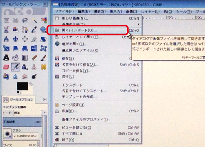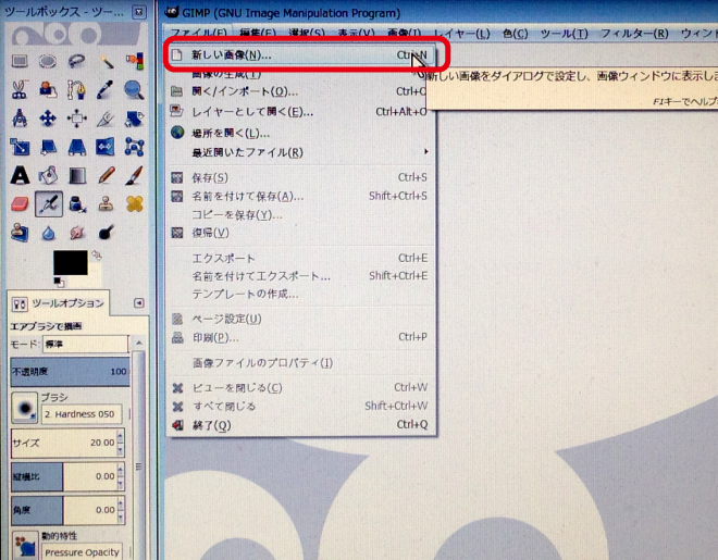 1.GIMPを開き、メニューバーから「ファイル」-「新しい画像」をクリックします。