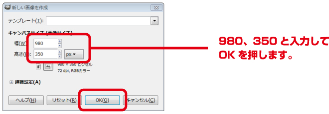 2.「新しい画像作成」が表示されるので、幅を980px、高さを350にしてOKをクリックします。